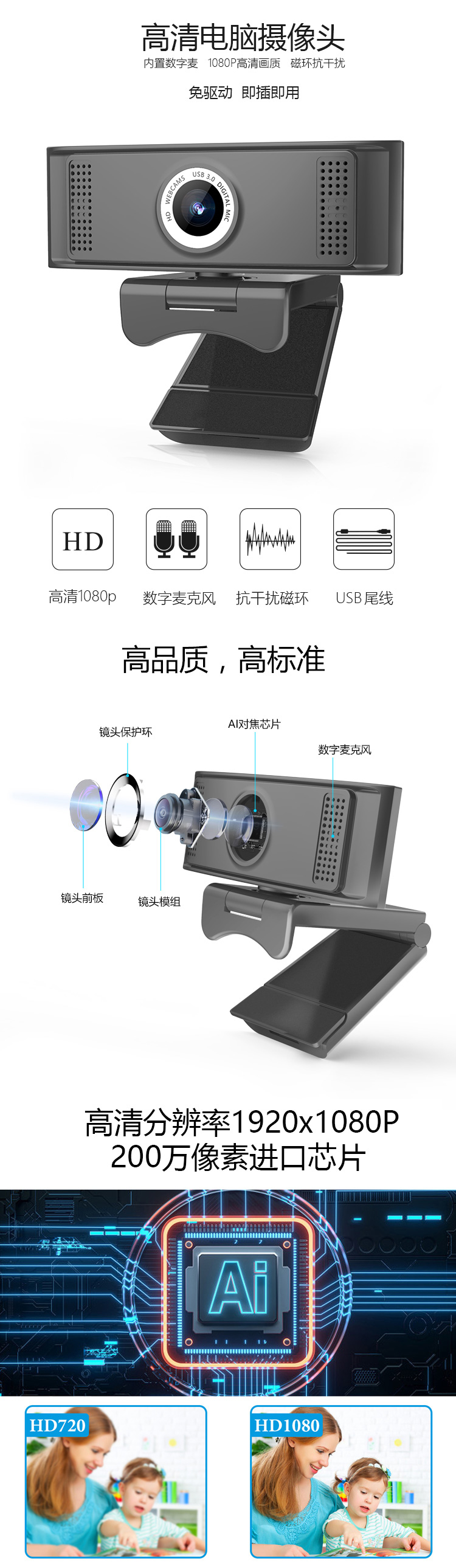 高擎威影 电脑HD防犯カメラ考研复试带麦克风一体外部电脑台式笔记本网课教学USB防犯カメラ视频直播装置 1080PHD款【内置2米收音麦克风+进口芯片】【图片 价格 品牌 报价】-