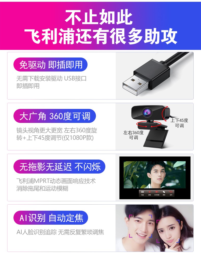 飞利浦HD防犯カメラ带麦克风电脑台式机笔记本USB外置视频网课外部广角主播直播学生考试教学家用录课 1080P双倍超HD【自动定焦+进口硅麦】即插即用【图片 价格 品牌 报价】-